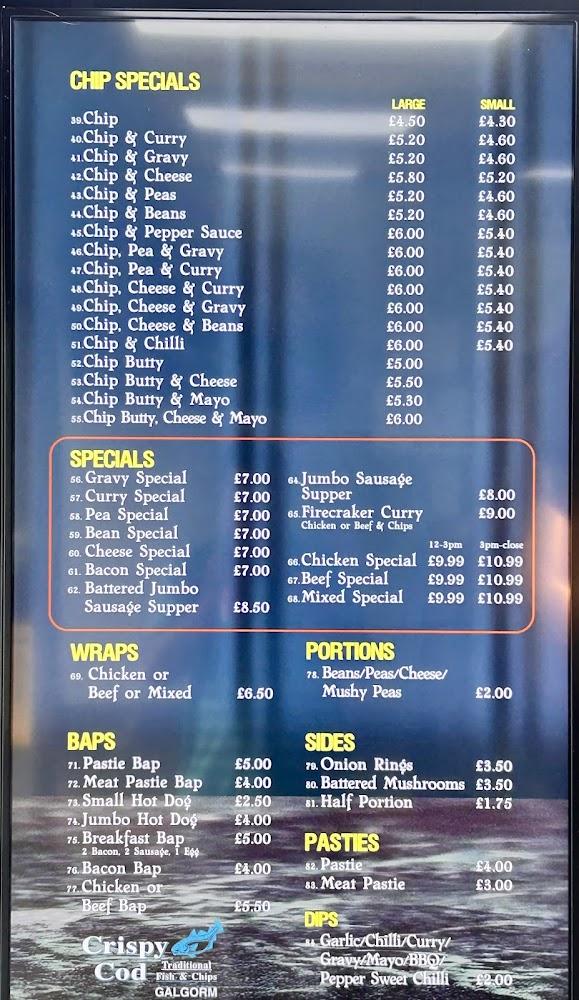 Nestled in Galgorm Court on Fenaghy Road, The Crispy Cod is more than just a chip shop; it’s a community staple in Ballymena. The eatery pays homage to authentic fish and chips culture, ensuring everything is cooked to order from fresh, local ingredients. Its long-standing presence in the area reflects the trust established over the years among patrons who appreciate authentic flavor and personal service. Inside, the atmosphere is relaxed and inviting, perfect for family lunches or casual dinners. Equipped to accommodate different needs, the establishment features wheelchair-accessible entrances and seating options. With operational hours that cater to both lunch and dinner crowds, The Crispy Cod shines especially brightly on Fridays when everyone comes in for their weekend fish and chip fix. Plus, free parking makes it easy to pop in for takeout.
